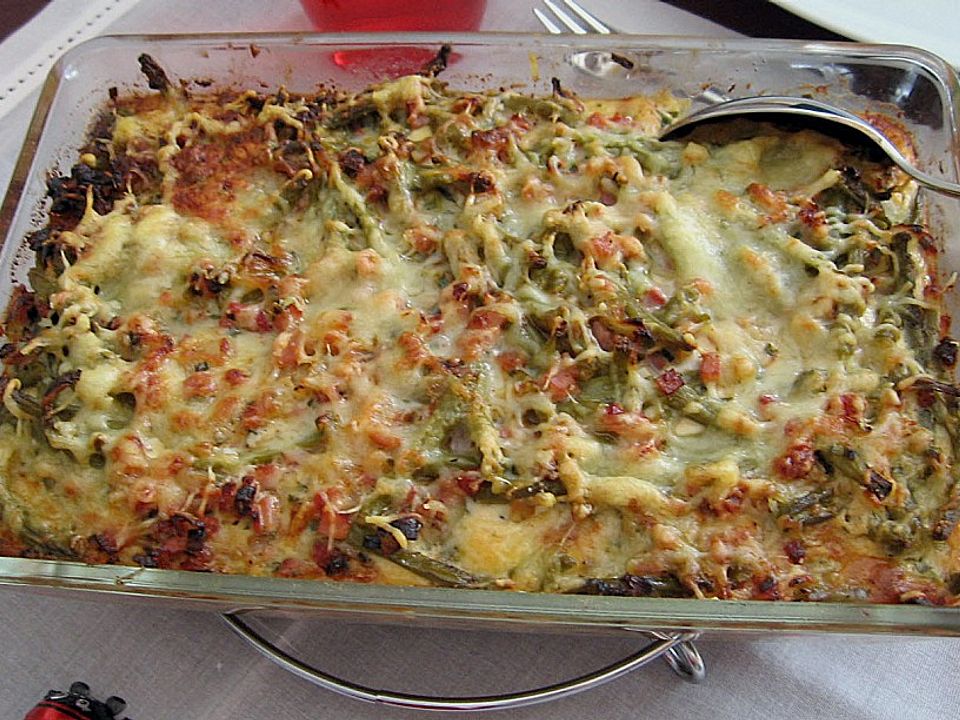 Bohnen in Stücke brechen und in Salzwasser kochen, abtropfen. Speck würfeln und anbraten, gewürfelte Zwiebeln und Knoblauch dazu, in Streifen geschnittener Schinken, Kräuter und Bohnen dazu geben, alles in eine gefettete Form geben.